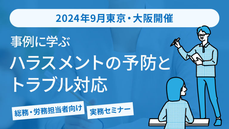 中小企業の総務・労務担当者を対象とした実務セミナー「事例に学ぶ ハラスメントの予防とトラブル対応」を2024年9月に東京・大阪で開催します。 開催日時・会場 東京 大阪 詳細情報 / お申込みはこちら